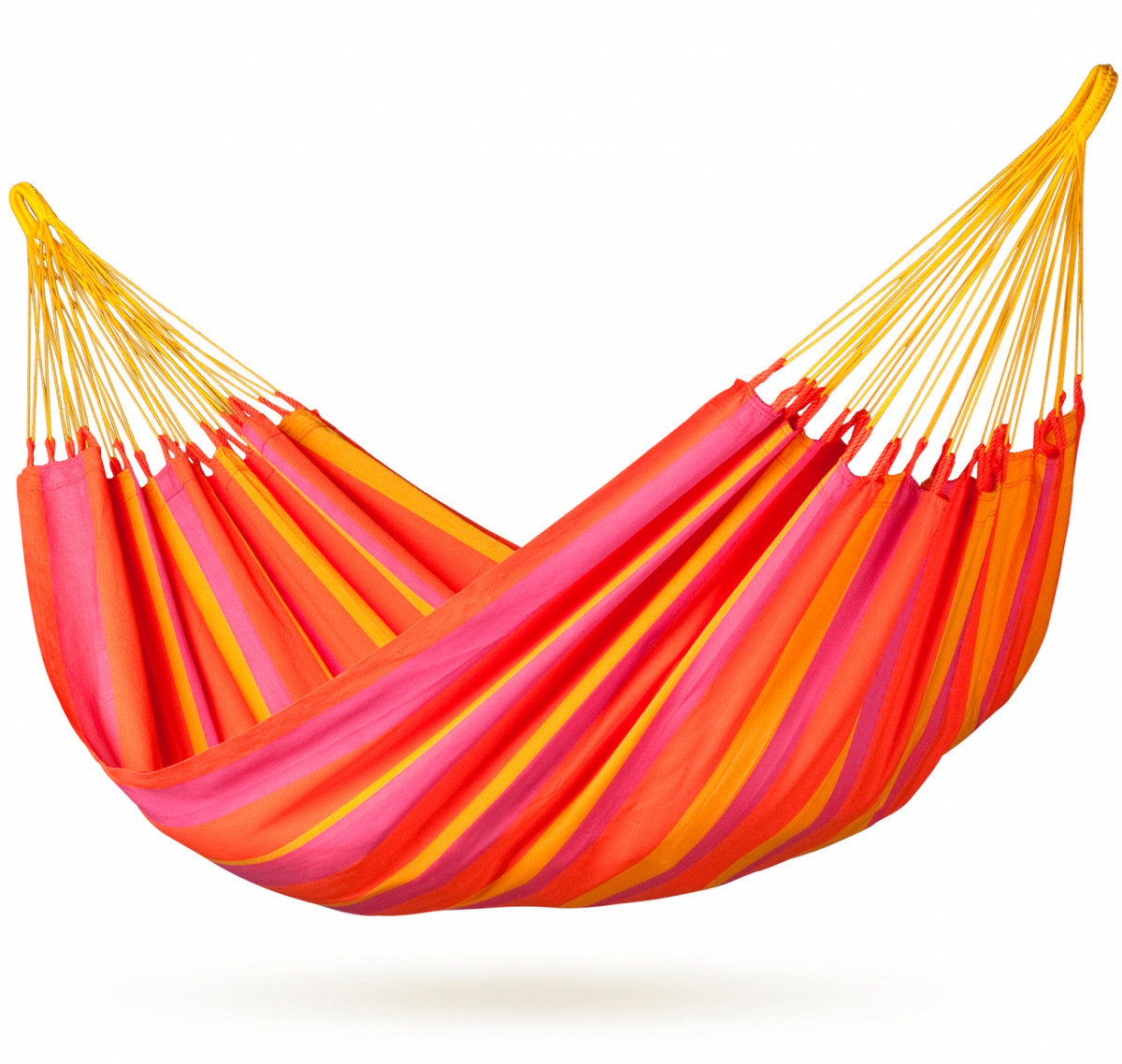 Двухместный гамак ручной работы изготовлен из высококачественного чистого хлопка в Колумбии, где гамак является неотъемлемой частью ежедневной жизни. Характерной особенностью гамаков, произведенных в Колумбии, является конструкция подвеса в виде разомкнутой петли, что позволяет крепить гамак как традиционным способом – к деревьям или опорам, так и к специальному деревянному каркасу. Надежные подвесные канаты обеспечат равномерное распределение веса, а благодаря удвоенным нитям по основе ткани, этот гамак особо прочен и позволит вам наслаждаться безмятежным отдыхом в нем долгие годы. Гамаки серии Currambera отличаются яркими, износостойкими тканями и разнообразием конструкций: предлагаются одноместный гамак, гамак на двоих, гамак с траверсами перекладинами, кресло-гамак, гамак-шезлонг. Отдых в гамаке подарит вам особенное ощущение свободы и невесомости, позволит расслабиться мышцам спины и шеи, ощутить душевный комфорт и уют от ощущения кокона, которое дарит любой гамак, вне зависимости от конструкции.