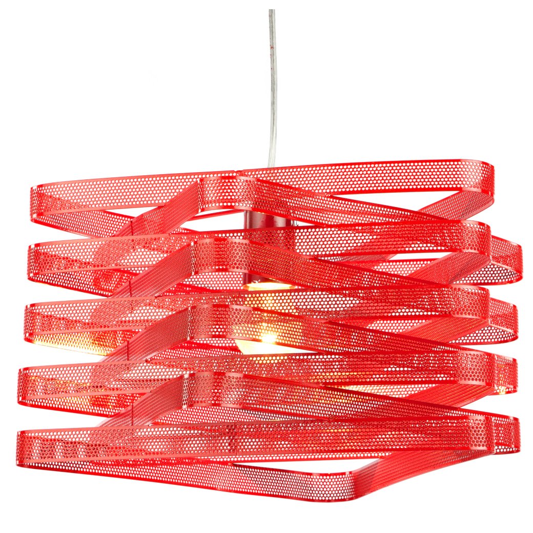 Подвесной светильник Infinity, со стальным основанием красного цвета, крепится на тонкой гибкой подвеске. Абажур в виде металлических сетчатых лент красного цвета, элегантно закрученных вокруг лампочки, направляет свет вниз. Светильник надежен, удобен и красив. Длина провода 83 см.